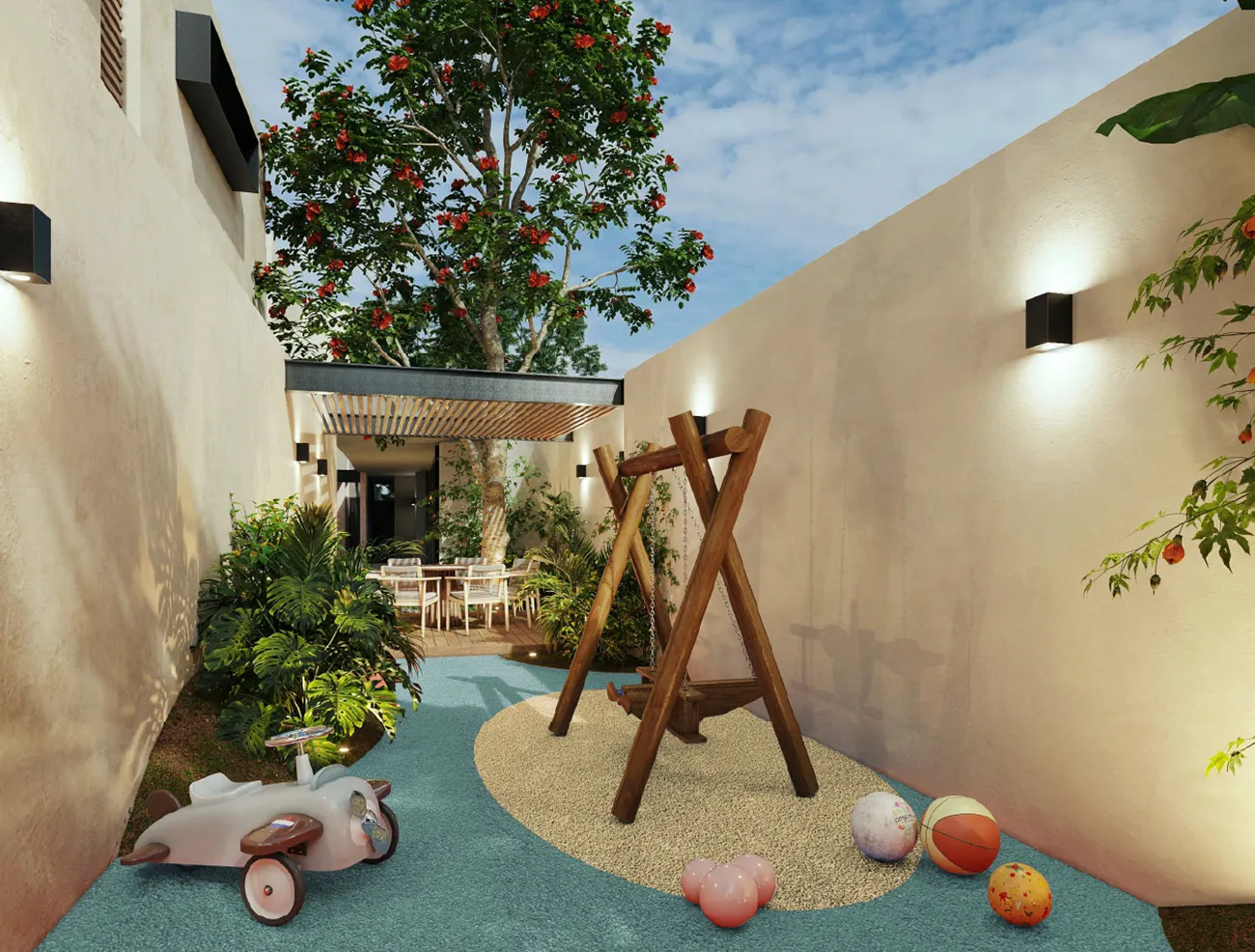 Una zona infantil con una terraza para los papás y un área de juegos para los niños.