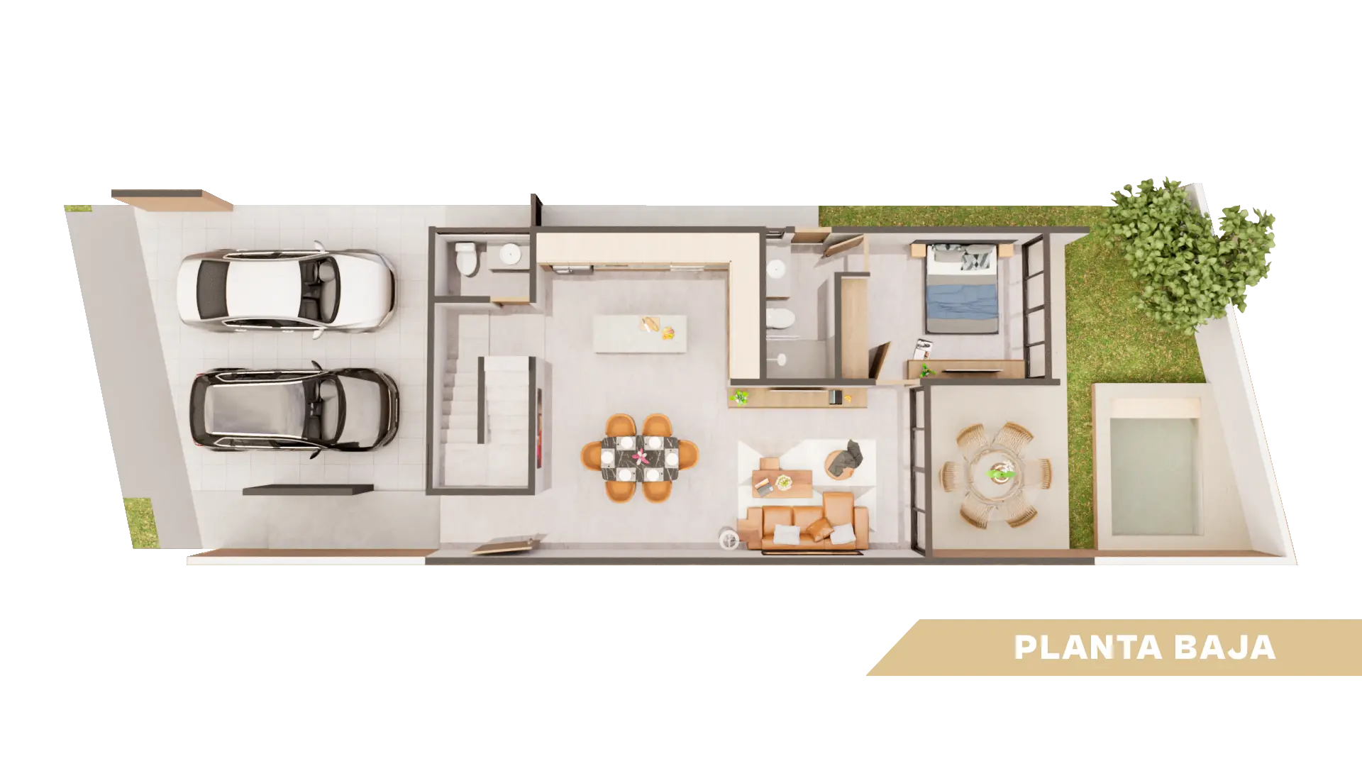 En la planta baja: estacionamiento para 2 autos, sala, comedor y cocina integrados para una mayor convivencia, una habitación de visitas y un baño y medio.